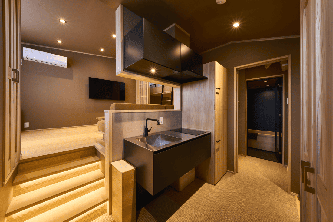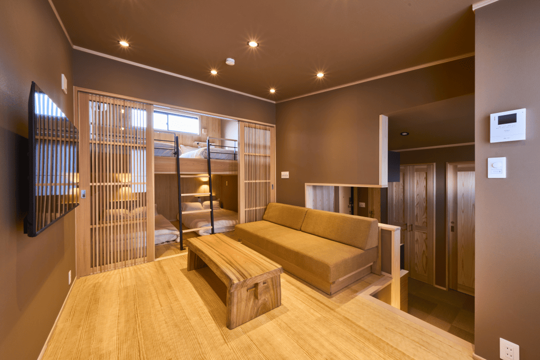 1部屋あたり最大5名様までご宿泊可能です。全室にフルキッチン(調理器具・食器完備)や洗濯機などを備え、まるでこの地に暮らすように滞在できる快適な空間をご用意しました。長期滞在はもちろん、さまざまなシーンに合わせてご利用ください。